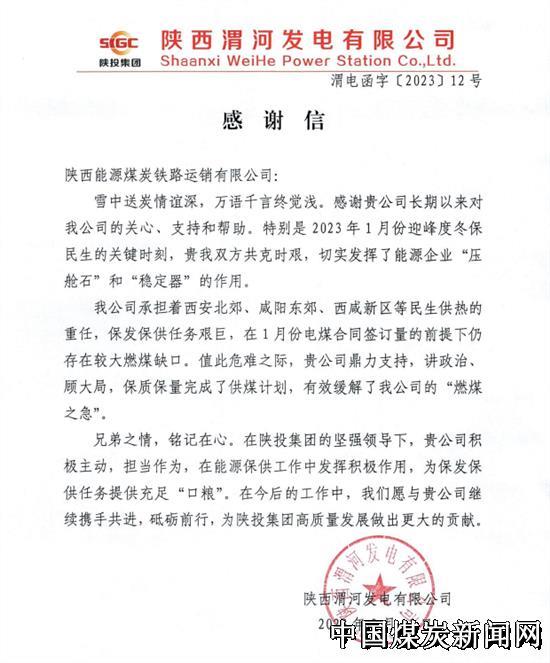 2月13日,陕西能源煤炭铁路运销有限公司收到来自陕西渭河发电有限公司的感谢信,对铁路运销公司长期以来的关心、支持与帮助,特别是在2023年1月份迎峰度冬保民生的关键时刻给予的鼎力支持表示由衷的感谢。 铁路运销公司自承担电煤保供任务以来,积极贯彻落实中、省及集团公司…