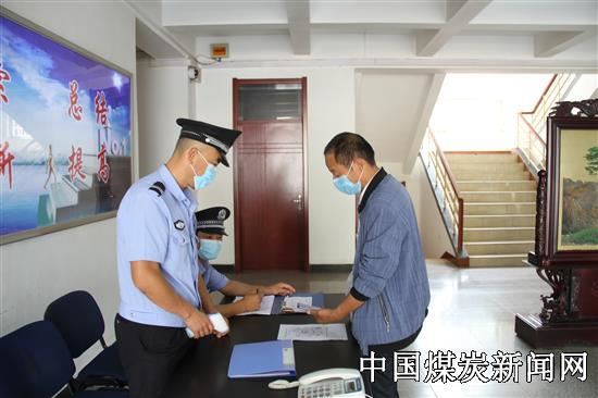 在该矿疫情防控机关楼检查点,保卫值班员正在有序检查职工进入办公楼。